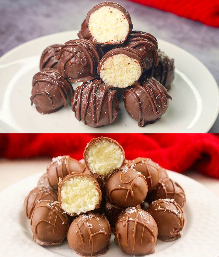 Die gekühlten Kokoskugeln vorsichtig in die geschmolzene Schokolade geben und rollen, bis sie komplett überzogen sind. Es ist besonders einfach, mit einer Gabel oder einem Schaschlikspieß zu arbeiten.