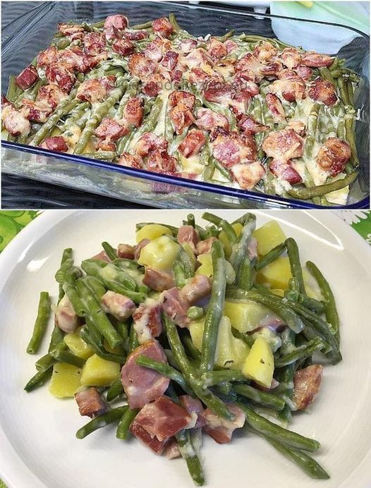 Die angebratenen Kasselerstücke und die blanchierten Bohnen zur Pfanne geben, gut vermengen und 2–3 Minuten in der Sauce ziehen lassen, damit alles den Geschmack annimmt. -