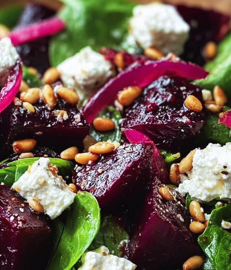 Rote-Bete- und Ziegenkäse-Spinat-Salat mit gerösteten Pinienkernen