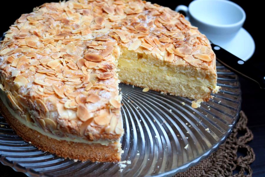Die heiße Mandelmasse gleichmäßig auf dem vorgebackenen Kuchen verteilen und weitere 10–15 Minuten goldbraun backen.