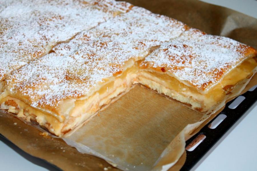 3️⃣ Vanillepudding gleichmäßig darüber verteilen und die zweite Hälfte des Blätterteigs darauflegen.