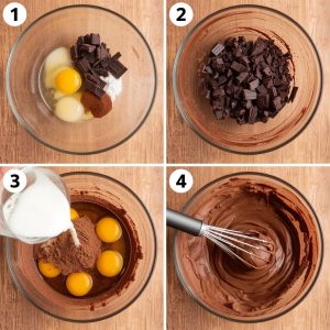 Sahne erhitzen (nicht kochen), Schokolade darin schmelzen.