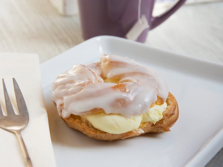 - Spritzkuchen abkühlen lassen, aufschneiden, mit Vanillecreme füllen und mit Puderzucker bestäuben.